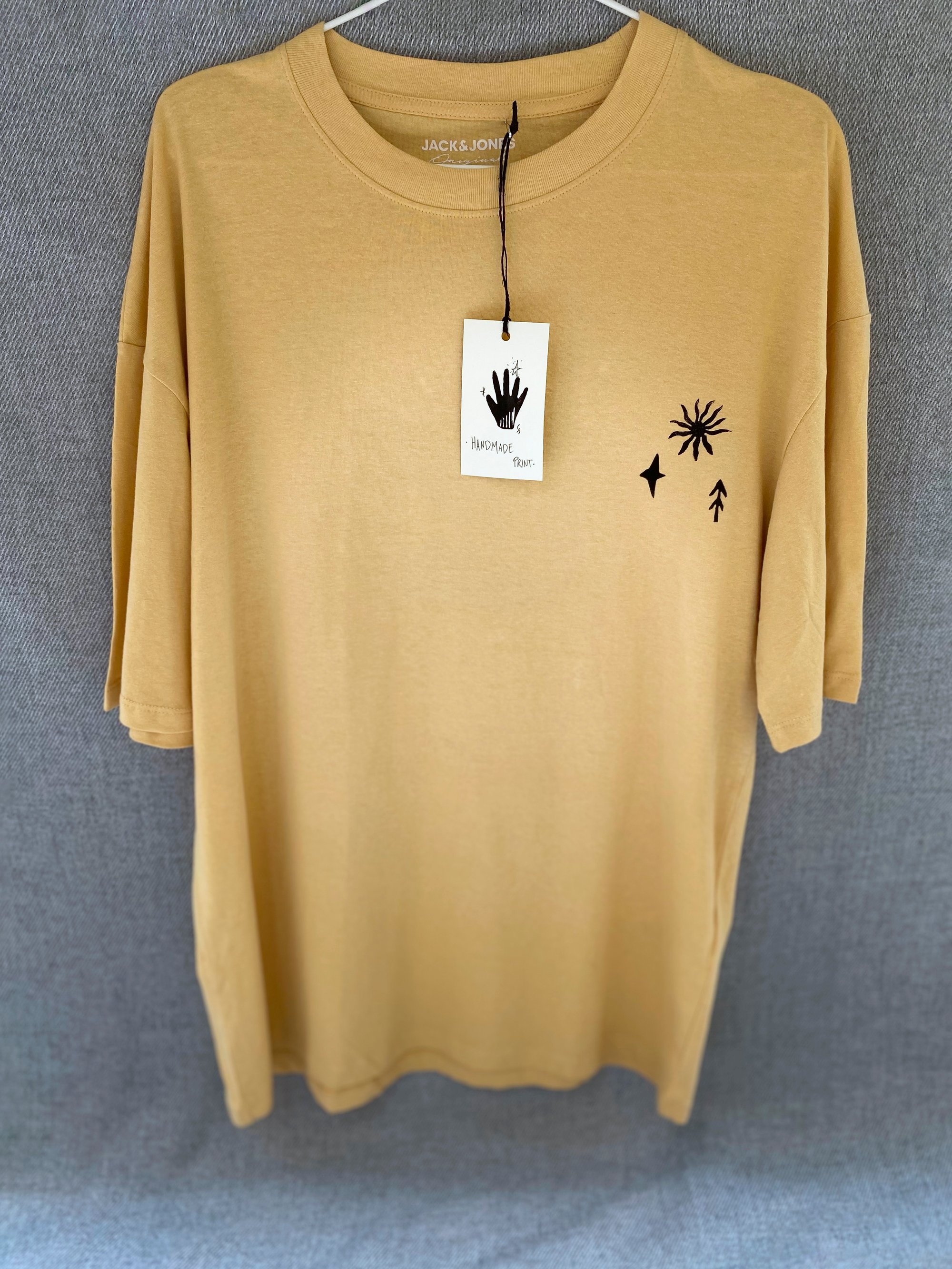 Handprinted linómetszetes póló – 100% pamut, egyedi mintával, elől és hátul