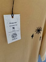 Minden póló egy kézzel metszett linónyomda segítségével készül, textilfestékkel, hagyományos block printing (kézi nyomás) technikával. Ez azt jelenti, hogy minden darab egyedi – apró eltérések lehetnek a festék eloszlásában, textúrájában, ami a kézműves munka szépsége, egy kis vintage hatást ad a mintának.